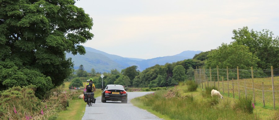 08 cars, cyclists and sheep on A861, Ruth’s coastal walk up Loch Linnhe