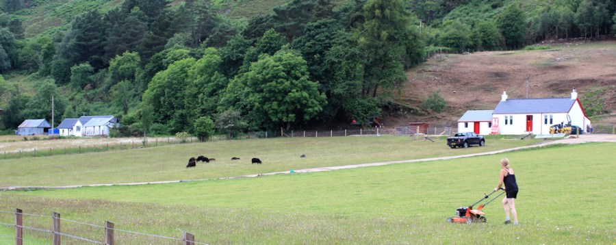33 mowing a field, Trioslaig, Ruth hiking in the Highlands