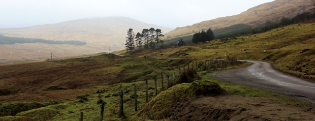 I’m surrounded by empty landscape. Only down in the valley is one little building, completely dwarfed by the steep slope above. That hill is called Beinn nam Beathrach and, at 582 metres, is almost a mountain. I can’t see the top because it is covered in cloud.