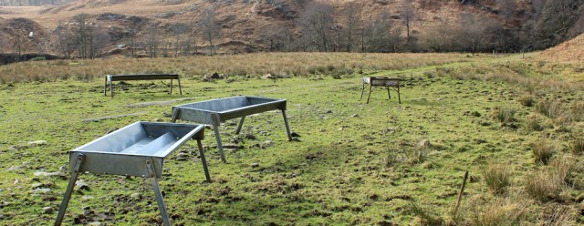 The track widens into a broad green space, dominated by feeding troughs. Too high for sheep. Must be for cattle. Oh no!