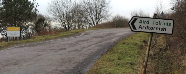 It’s funny how there’s always a part of a walk that seems more of a struggle than it should do. I battle the wind to the top of the hill. Here’s another turn off, the second in two miles, and this one is to a place called Ardtornish.