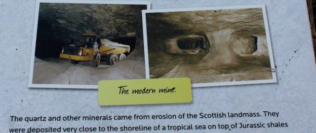 Further on and I come to an information board telling me about the silica mine still operating nearby. Originally started during the war to make high-quality glass for periscopes and gunsights, the silica is still mined for glass production. Apparently the sandstone cliffs here contain some of the purest silica in the world.