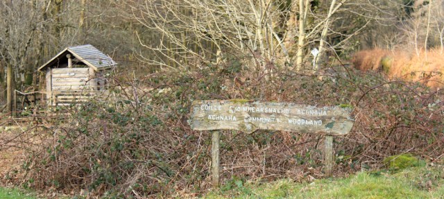 I come to a small area of woodland on my left, with a parking area, a little shed, and a rustic sign, informing me this is Achnaha Community Woodland.