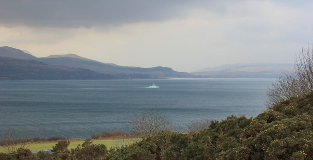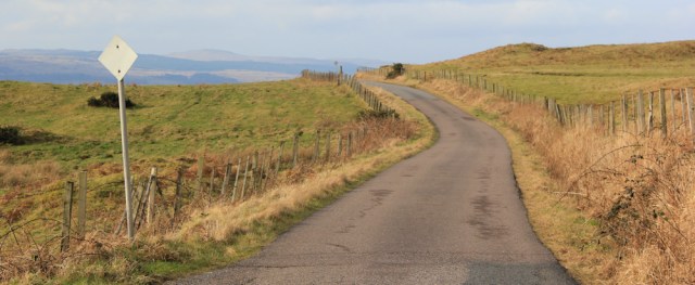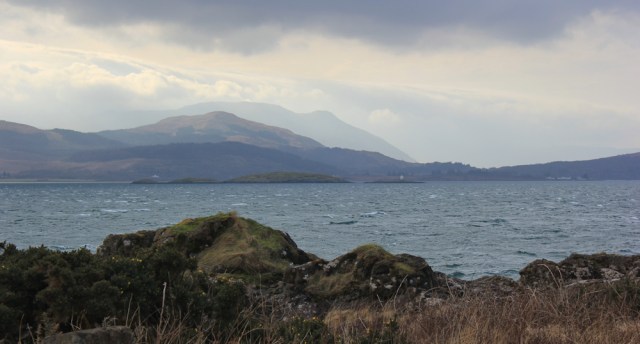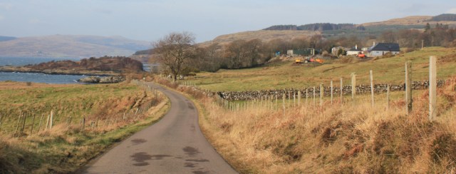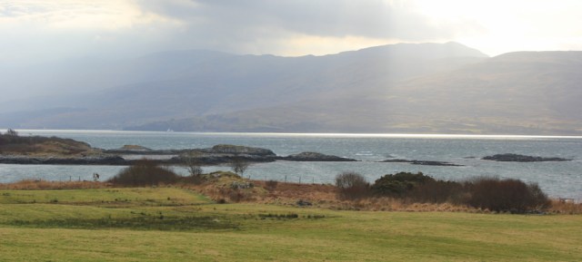 The sun is shining – pale and cool. This is a pleasant road, running half a mile inland, but with good views over the Sound of Mull.
