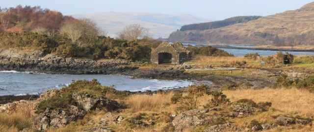 There is an interesting outcrop of rocks here, and a tidal island with the remains of a ruined cottage. (The tidal island is called Eilean na Beitheiche, according to my map, but doubtless it has numerous other names too!)