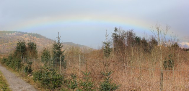 I think it must be something to do with the latitude and the angle of the sun’s rays, but all the rainbows I’ve seen in Scotland tend to be rather flat. In fact, I saw a beautiful one across Loch Lomond on the way up here, but it’s arch was lower than the surrounding hills.