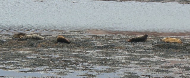 I peer out through the gaps in the fence. Can’t see any exciting birds, but I do spot some seals lying on a mud bank. They look as though they’re sunbathing. Shame there’s no sun..