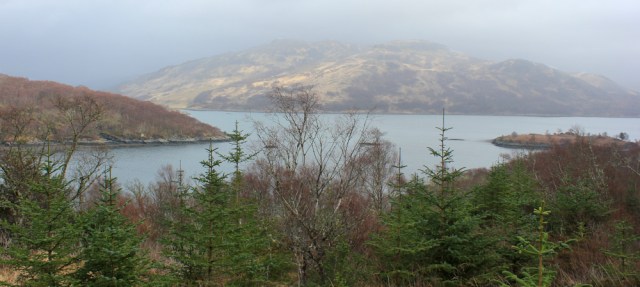 Up high again, and through the trees is a view towards the entrance to Loch Teacuis. The Island of Carna – on the left of the photo below – sits across the mouth of the loch, creating two channels. I’m looking up the eastern one.