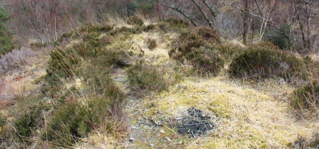 On this ridge of high ground, I pass the remains of an old fire, and a flattened area. Has someone been camping here? Maybe another coaster?
