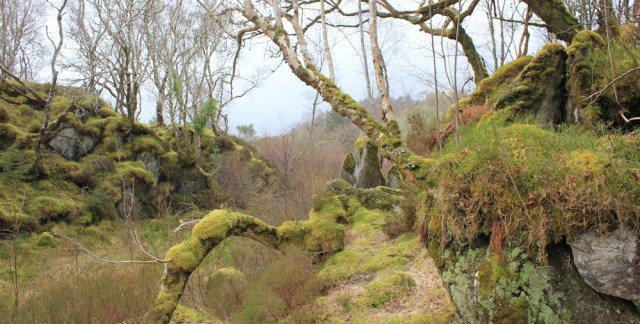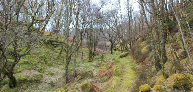 Onwards. The path climbs up through a little valley, clinging close to moss-covered rocks and roots.