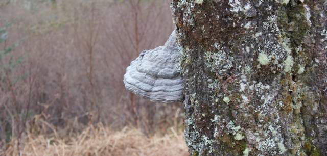 On a fine day, you would be able to see the hills of the Ardnamurchan Peninsula, but today everything in the distance disappears into a murky mist. Best to focus on closer objects, like this amazing piece of fungi clinging to the beautiful bark of an old tree.