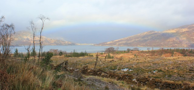 Looking across the open space created by logging, and there’s the end of Loch Teacuis, framed by another one of those beautiful, low, Scottish rainbows.