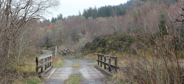 The track becomes a path, and the path gets narrower and narrower, until – eventually, 5 or so miles later – it crosses a rickety bridge and ends, somewhat abruptly, at a bench. But the bench is situated in front of a curved fence, obscuring the view of the end of the loch.