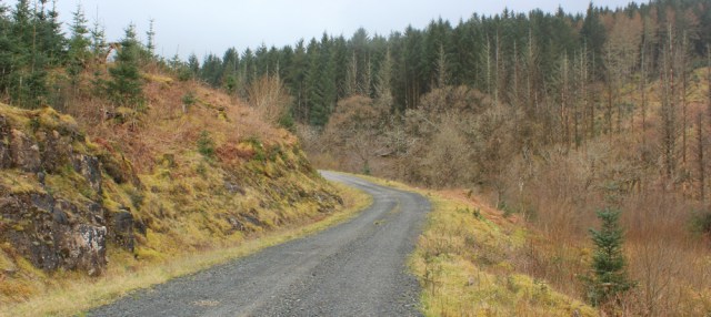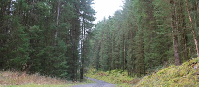 I turn round and head back down the track. The surface seems fairly new, and the gravel is rough and sharp under my feet, so I find the return hard going. Here I meet the first person I’ve met all day, driving past in one of those all-terrain vans. I wonder if he is a forestry worker? Or perhaps he came looking for waterfalls too?