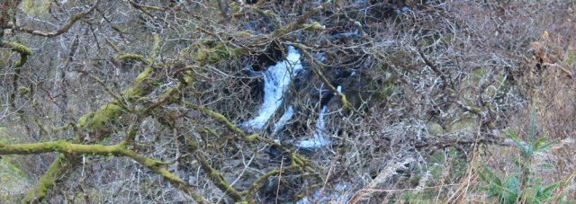 … well, they’re down there, somewhere. I can hear them, and spot white flashes of water through the trees. Good thing the branches are bare, or you wouldn’t be able to see the falls at all.