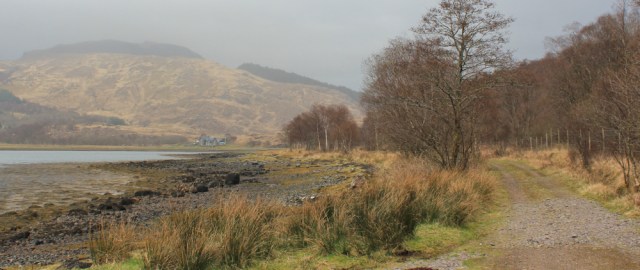 The track is flat and curves around the end of the loch, giving access to a couple of houses. From their shuttered looks, I guess they might be holiday homes.