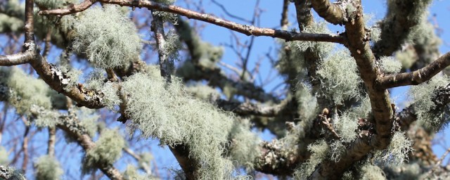 Information boards in the car park described several wild flowers you can find here, but it’s still early April, and so very few flowers are out. I do, however, notice how the bare tree branches are festooned with feathery lichen.