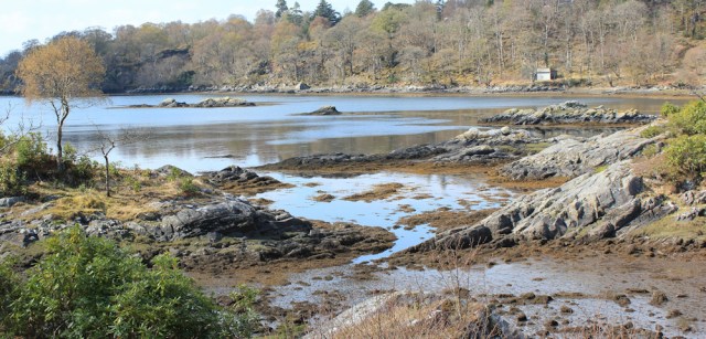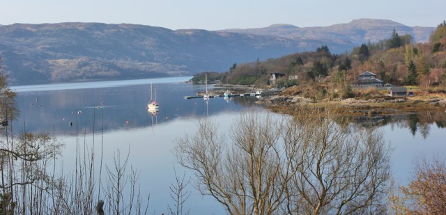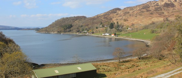 No sign of Glenborrodale yet, but here’s a lovely bay. The tide is beginning to receed, exposing a muddy shore.