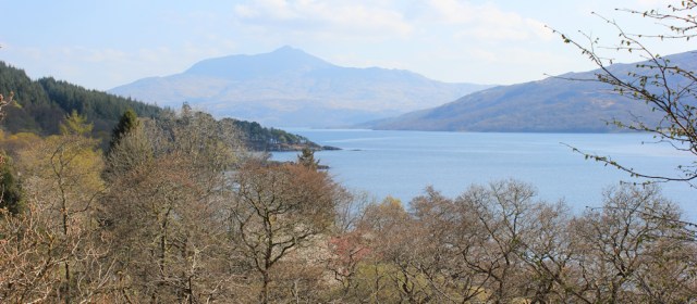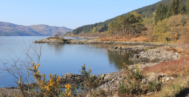I leave the road and sit on some rocks overlooking the water. Time for a rest and it’s also breakfast time. I eat a croissant provided by the B&B, and admire the wonderful view looking back up Loch Sunart, a view dominated by the mountain that squats across the far end of the loch.