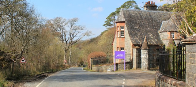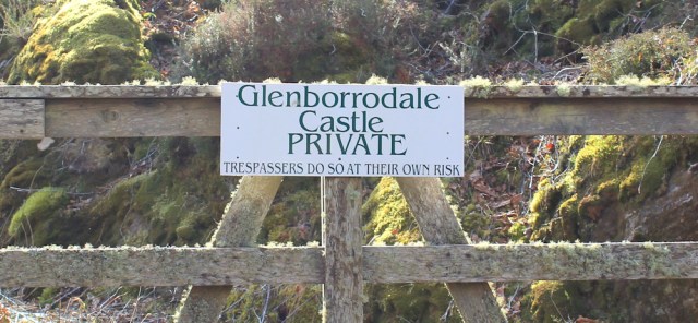 A few yards further along the road and here’s a pair of gates and a drive. “Glenborrodale Castle. PRIVATE” says the sign. “Trespassers do it at their own risk.”
