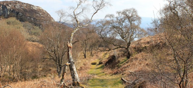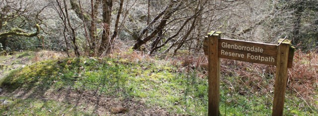 I climb up the wooden steps, clamber up a muddy slope, and join a path. A sign tells me this is the Glenborrodale Reserve Footpath.