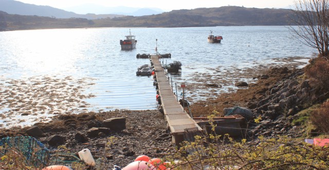 Apart from the huge fishing farms, I haven’t see much evidence of local fishermen, but this bay has a wooden jetty and several small fishing boats are moored nearby in the loch.