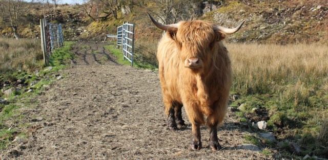 Highland cattle are munching the grass in a nearby field. This one takes an interest in me, trots up to greet me at the gate, and poses nicely for a photograph.