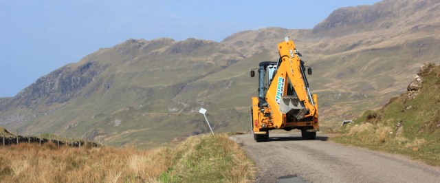 The landscape opens out, and the big bulk of Ben Hiant looms ahead. A rumbling sound behind me, and I turn to see a bright yellow digger coming along the road. Stand aside to let it pass.