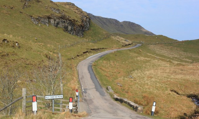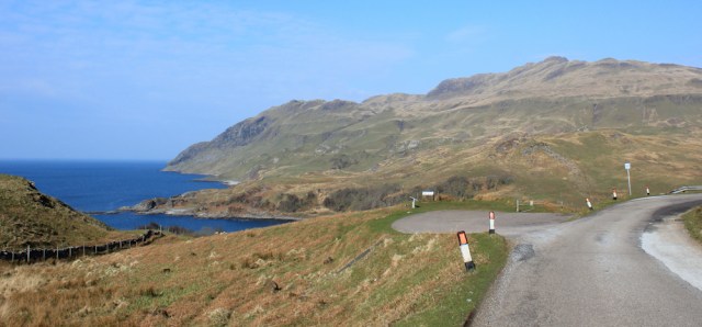 Onwards. I follow the road around the corner, as it turns inland and hugs the curves of the hill Beinn Bhuidhe…