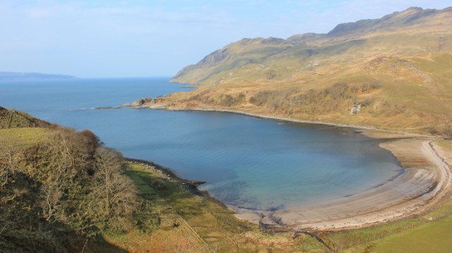What a lovely morning! The road takes me sometimes inland, and sometimes along the edge of a series of little bays. Port na Croisg, Camas Fearna, Camas Ban.