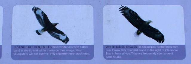 I plan to have breakfast at the Visitor Centre, but I’m 10 minutes too early and it hasn’t opened yet. Outside, the information boards tell me how to recognise sea eagles (I’ve spotted several over the past few days) and golden eagles (not sighted yet)