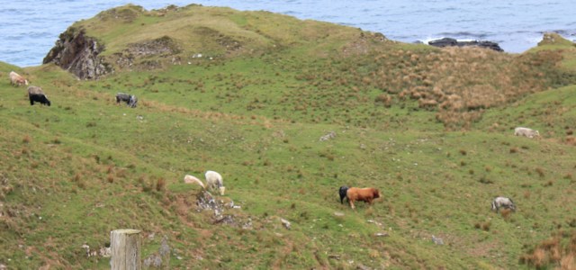 I stick to the road. A little further on, and I spot the cattle down by the cliffs. It’s a herd of that lovely Blue Grey breed, with one big red/brown cow in the middle. Oh… hang on. That big cow isn’t a cow at all. It’s a bull.