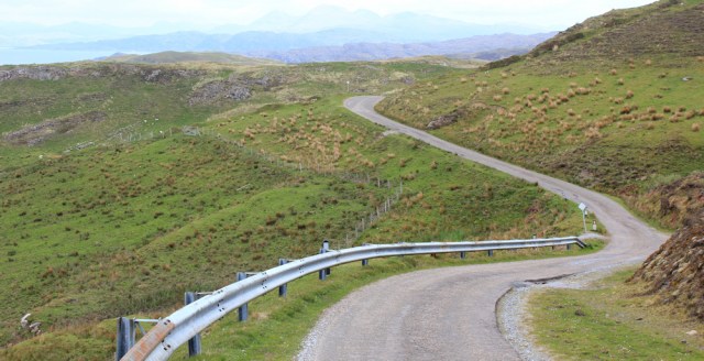 The road twists and rises. What a wonderful view. I try and work out what I’m looking at. I think the highest mountains in the distance are on Skye. But is the nearer piece of land Eigg, or Rum, or even the mainland?