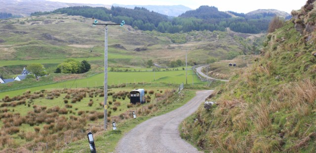 Onwards along the road. Going downhill now. What’s that scruffy-looking van doing in the field?