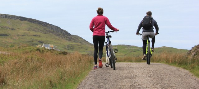 Coming up the road towards me are a couple of cyclists. Mountain bikers. The man is riding, but the woman, tired from the slope, slips off and starts pushing her bike. I wonder where they’ve been?