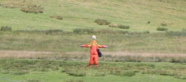 In a field below is a workman in hi-vis clothing. What is he doing, why does he need such bright overalls, and why is he waving at me? Oh, no, silly me. It’s not a real man. A scarecrow!