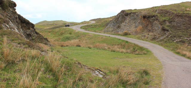 The road rises again and the landscape looks wilder now. Less agricultural-looking. The turnoff ahead (marked by a wooden box) leads to a place called Port an Droighionn.