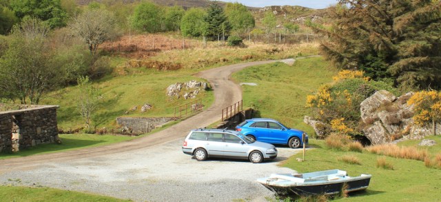 I drive down the winding single-track road to Ockle (love that name!), where I park at the end of the road, next to a car and an old boat.