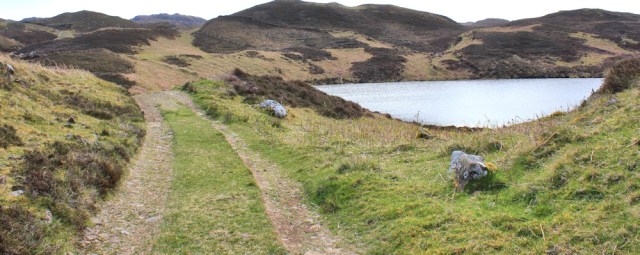 Across a wide, open area of undulating slopes, the track leads gently uphill, and down, and up again. It skirts past a little lake, nameless on my map.