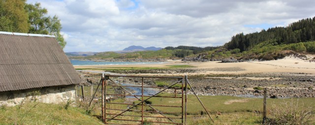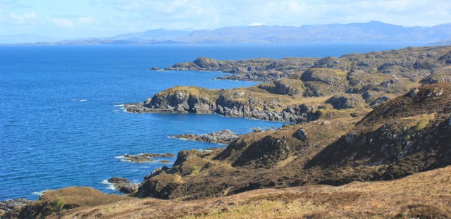 The track runs parallel to the shore and, although I’m some distance inland, I’ve got great views over the sea. I keep stopping to take photographs. The mountains over there must be… maybe that’s Skye? The view is getting hazier as the day warms up.