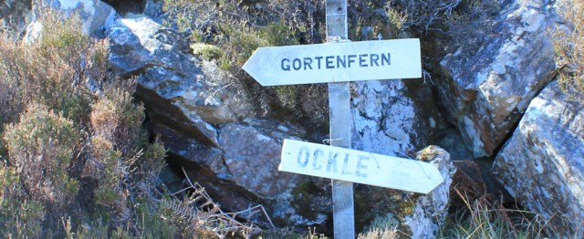 Here’s another sign by the rocks. Ockle is back along the track, but if I take this narrow path up the hill I’ll come to Gortenfern.