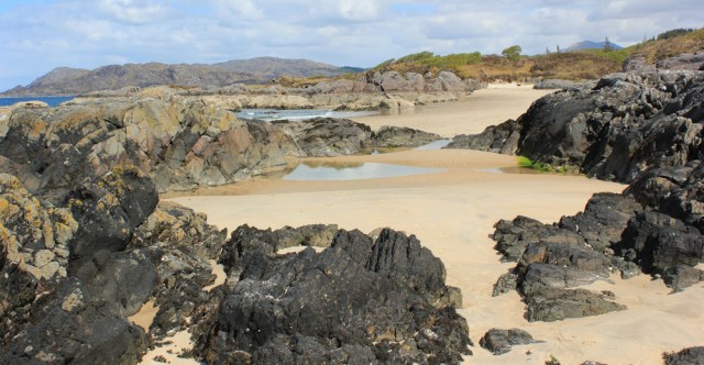 Gortenfern? Where on earth is that? I’m heading to a beach called Singing Sands. Perplexed, I swing my rucksack off my shoulders. Time to check my paper map, have a drink, and apply some sun block. It’s hot!