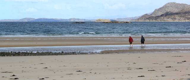 A shouting sound makes me look up. Two of the men are heading towards the sea, barefoot across the sands, and squeal when they reach a strip of cold water.