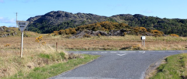Ahead is the junction with the B8044. I could turn right at this point, and head towards Acharacle (a choice well within my rules) and then walk straight up the road to cross over the Shiel River at Shiel Bridge…