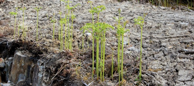 But nature is fighting back. Shoots of bracken have begun to reclaim the mud. Their green stems look deceptively thin, but have knifed through the dried surface – stretching tall and uncurling brilliant green fronds at their tips.
