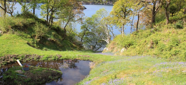 I scramble to the top, and discover that whatever notices the wooden posts once displayed, they’re no longer there. Anyway, the views over Kentra Bay are great. It looks so much better in sunshine, and with its muddy floor covered by the blue water of a high tide.