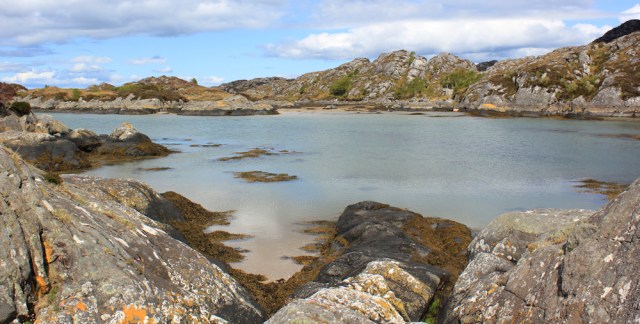 At the top of the hill, I leave the road and climb up onto some rocks to get a better view of the water below me. This is the narrow exit channel, where Kentra Bay flows out and into the sea.