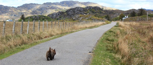 Eventually I manage to shoo it away, and it heads back up the road towards the place with the horrible name – Gobshealach. But I soon hear the pitter patter of paws, and it’s back again, first following at my heels, and then insisting on leading the way.