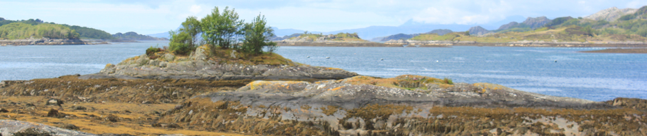 The top of Loch Ailort is really beautiful. The sun plays tag across the hills on the opposite shore, and I love the string of pretty little islands that lie in the middle of the loch. With brown skirts covered in seaweed, contrasting white rocks above, and topped with a green icing of grass and shrubs, they look as if they’re floating on the water.