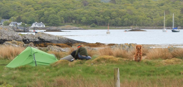 Through a gate, where a sign tells me to keep my dog on a lead, I enter a field and the track becomes a path. On the other side of the fence, a couple are busy taking down their tent while their dog watches me. A lovely place to camp.
